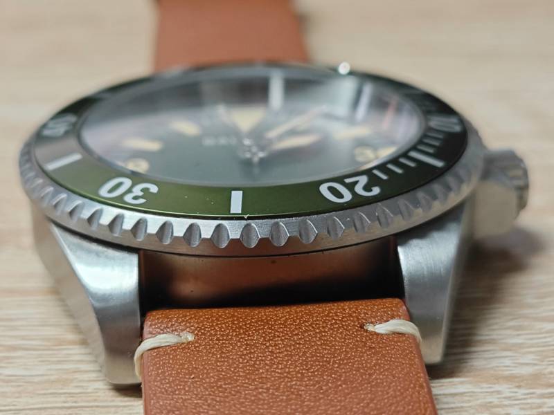 A double-domed sapphire crystal provides period-correct profile and modern durability. Internal AR improves legibility in strong light. The unidirectional bezel (120 clicks) uses a stainless body with deep scallops for grip, paired with a vintage-style aluminum insert and a color-matched luminous pip at 12.